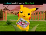 Nice Cards are collectible cards obtainable in the Pokémon Channel video game. There are three types of Nice Cards: Single cards, which have a Pokémon's picture on them, Motion cards, which have a hologram of the Pokémon, and Platinum cards, which have a hologram and play the Pokémon's cry. Most Pokémon are available in all three, but only one is needed for it to count towards a player's total cards. Nice Cards can be obtained by the player by receiving them from Pokémon met in the game, or they can order them in booster packs from the Shop 'N Squirtle channel. There are 110 different Nice Cards in total, nine of which are special Pikachu cards.