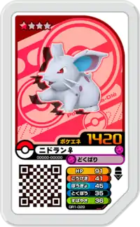 Nidoran♀ (Japanese: ニドラン♀ Nidoran♀) is a Grade 1 Pokémon Ga-Olé disk. It is part of the first Grand Rush set.