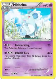 Poison Sting and Double Kick are both moves in the Pokémon games that Nidorina can learn. This card's Pokédex entry comes from Pokémon Black 2 and White 2.