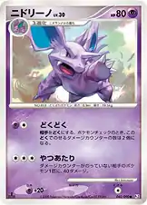 Toxic and Frustration are both moves in the Pokémon games that Nidorino can learn by TM06 and TM21, respectively. This card's Pokédex entry comes from Pokémon Diamond, Pearl, and Platinum.