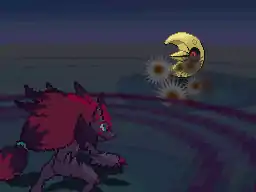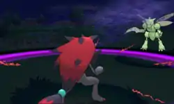 While disguised as Lycanroc, Zoroark's eyes glow red and it raises its front two paws into the air. Its body then becomes surrounded in a crimson aura. Zoroark then brings its paws down to the ground and a pink and crimson forcefield of energy appears around Zoroark's body and expands outwards throughout the whole battlefield. | ||