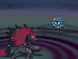 Zorua's eyes glow light blue and it raises its front two paws into the air. Its body then becomes surrounded in a crimson aura. Zorua then brings its paws down to the ground and a pink and crimson forcefield of energy appears around Zorua's body and expands outwards throughout the whole battlefield. | ||