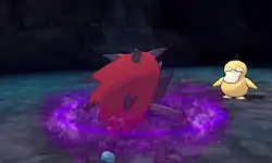 Zoroark's eyes glow light blue and its body becomes surrounded by a crimson aura. It then raises its arms above its head. When it does, the aura around its forearms gets thicker. It then slams its arms down into the ground. A pink and crimson glowing forcefield of energy appears from the aura around Zoroark's arms and grows larger, spreading all around it. The thicker the aura is around Zoroark's arms, the more powerful the attack becomes. | ||