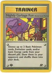 Nightly Garbage Run (Japanese: 夜の廃品回収 Evening Garbage Collection) is a Rocket's Secret Machine card. It is part of the Team Rocket expansion.