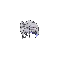 In the Alola region, Ninetales has a different appearance. Its coat is pale blue, and its fur is more flowing and wispier. The tips of its tails and crest, as well as the lower halves of its legs, are white. The crest on its head is longer and its nine tails are less distinct from each other. Finally, it has larger eyes, which are blue, and small tufts of fur in front of its ears.