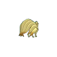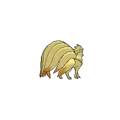 Ninetales is a fox-like, quadrupedal Pokémon covered in thick, luxurious golden-white fur. It has a small mane of thicker fur around its neck and a long, fluffy crest atop its head. It has slender legs with three-toed paws and nine, long tails with pale orange tips. It has red eyes, pointed ears, and a triangular black nose.