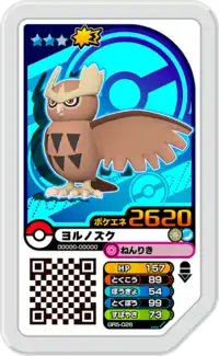 Noctowl (Japanese: ヨルノズク Yorunozuku) is a Grade 2 Pokémon Ga-Olé disk. It is part of the fifth Grand Rush set.