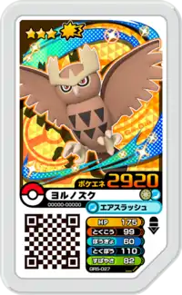 Noctowl (Japanese: ヨルノズク Yorunozuku) is a Grade 3 Pokémon Ga-Olé disk. It is part of the fifth Grand Rush set.