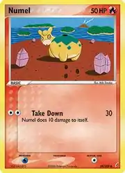 Numel (Japanese: ドンメル Donmel) is a Fire-type Basic Pokémon card. It is part of the EX Crystal Guardians expansion.