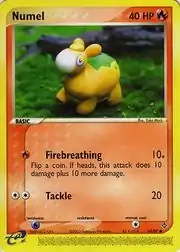 Numel (Japanese: ドンメル Donmel) is a Fire-type Basic Pokémon card. It was first released as part of the EX Dragon expansion.