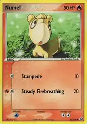 Numel (Japanese: ドンメル Donmel) is a Fire-type Basic Pokémon card. It is part of the EX Emerald expansion.