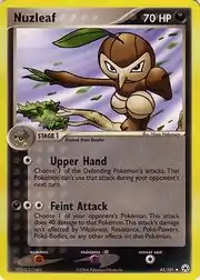 Nuzleaf (Japanese: コノハナ Konohana) is a Darkness-type Stage 1 Pokémon card. It is part of the EX Hidden Legends expansion.