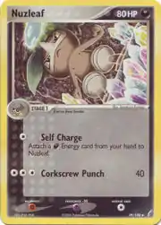 Nuzleaf (Japanese: コノハナ Konohana) is a Darkness-type Stage 1 Pokémon card. It is part of the EX Crystal Guardians expansion.