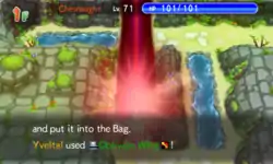 Yveltal creates a transparent violet sphere in front of it, with blue electricity-like energy in it. It then shoots a violet beam of energy. Anything touched by the beam withers, or turns into stone. | ||