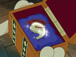 The Old Charm appeared in Dialga's Secret Keys, where Cynthia gave it to Hareta and Mitsumi and asked them to deliver it to her grandmother in Celestic Town. After Hareta had prevented Team Galactic from destroying the Celestic Town ruins with a bomb, he gave the Old Charm to Cynthia's grandmother.