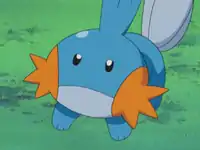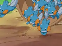 In A Mudkip Mission, one of the baby Mudkip fell into the river during a play fight, though Brock used his Lotad to save it and a bigger Mudkip helped them back to shore. Later, Team Rocket appeared on Swampy's property and set about trying to catch the young Mudkip. Their initial attempt failed after Brock Forretress, Lotad and Mudkip rescued all of the hatchlings from the flood waters. Afterwards Team Rocket used their Mudkip maiden robot to scoop up all the Mudkip. However their plot was again thwarted, with Brock having Lotad and Mudkip use water Gun on the ground to trap the mecha in the mud. Mudkip went onto free all the young ones before Pikachu sent the Rocket trio blasting off with a Thunderbolt. Some Mudkip's only known move is Water Gun. | ||