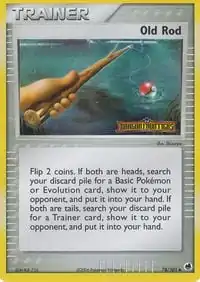 The Old Rod was introduced as a Trainer card in the Pokémon Trading Card Game during the English Neo Series (the Japanese Neo Era). It was first released in the Awakening Legends expansion before debuting in English in the Neo Revelation expansion, with an illustration by Keiji Kinebuchi. A reprint with new artwork by Shizurow was included in the Japanese Offense and Defense of the Furthest Ends expansion, and then released in the English EX Dragon Frontiers expansion. Old Rod lets a player flip 2 coins. If both are heads, the player can search their discard pile for a Baby Pokémon (Neo Revelation only), Basic Pokémon, or Evolution card and put it into their hand. If both coins are tails, the player search their discard pile for a Trainer card instead and put it into their hand.