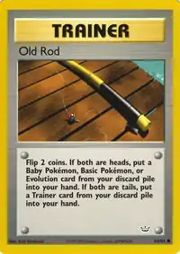 Old Rod (Japanese: ボロのつりざお Minor Fishing Rod) is a Trainer card. It was first released as part of the Neo Revelation expansion.