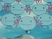 They turned around and suddenly all the Wooper were out of the pond and were causing mischief in the school building. Brock offered them some Pokémon food, but he ended up with all the Wooper climbing on top of him. Misty's Togepi found the tambourine and lead all the Wooper back to the pond, but the Wooper with the heart marking was still missing. Ash and Misty found it in the kitchen, but it suddenly jumped out the window and ran into the nearby forest towards a narrow rope bridge. Wooper then encountered Team Rocket, who tried to capture it with a Poké Ball. Pikachu found it, and after a battle Team Rocket captured it with a net. Wooper was able to break free, defeated Team Rocket's Pokémon and sent the trio blasting off. In the end, it was returned to Olesia. | ||