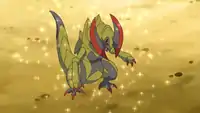 Druddigon was shown to be very strong, being able to withstand Dragonite's super effective Ice Beam and intercept it in the middle of a Dragon Rush. Druddigon's moves are Dragon Claw, Flash Cannon, Double Team and Dragon Tail. | ||