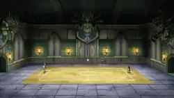 In the anime, the Gym is a stone building with two stone dragon statues lining the entrance to the building. Inside is a dimly lit battlefield with statues of Druddigon, Haxorus, and Hydreigon overlooking the field near the ceiling.