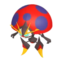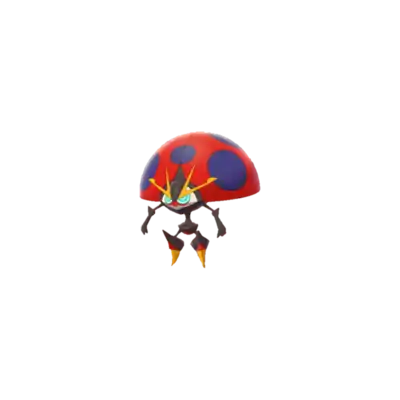 Orbeetle is a beetle-like Pokémon with a large head that resembles the body of a ladybug. The shell is red with seven black spots and a black underside. Its face is black and white with yellow antennae that resemble eyebrows and blue eyes with white rings. Its actual body is much smaller. It is mostly black with thin limbs and sharp yellow legs. Its arms have two claws and its feet are pointed.