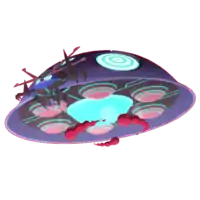 As Gigantamax Orbeetle, its body and brain drastically increase in size to resemble a flying saucer. Its wings disappear when in this form. The black spot on its head changes to become blue with white rings. Underneath the brain is five yellow half-orbs, each having three blue rings that split the orb into three, with a fourth black circle underneath it. At the center is a blue half-orb connected by nine blue lines. The orb shines a bright light that can move around similar to a flying saucer. Three red clouds float underneath the blue orb. The rest of Orbeetle's body is infused into a black orb with blue lines. These lines connect to blue half circles which are connected to the head, arms, and legs.