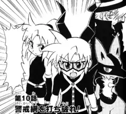 Breaking Into The Enemy's Lair! (Japanese: 警戒網を打ち破れ! Break Through the Lookout Net!) is the tenth chapter of the Phantom Thief Pokémon 7 manga.
