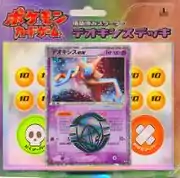 The Deoxys Constructed Starter Deck (Japanese: 構築済みスターター デオキシスデッキ) was one of two half decks to be released on July 1, 2004 alongside the Clash of the Blue Sky expansion. Like the main expansion, the half deck revolves around the DNA Pokémon Deoxys, which is featured as a Pokémon-ex card in its Normal Forme, and when combined with those from Clash of the Blue Sky, cover all three of Deoxys' currently revealed formes. The half deck focuses on Grass, Psychic, and Fighting Pokémon, and includes a rulebook, damage counters, status counters, and a coin.