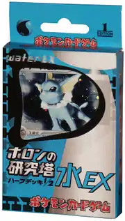 The Holon Research Tower Water Quarter Deck (Japanese: ホロンの研究塔ハーフデッキ1/2水EX) was among the three 15-card decks to be made available following the release of the Holon Research Tower expansion. While Water-type Pokémon are the focus, it is the only deck of the three to include fully evolved δ Delta Species Pokémon, which share Metal as a secondary type. Vaporeon ex is the deck's featured card, which also comes with a rulebook.