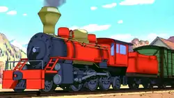 Meanwhile, back in the woods, Meowth and Wobbuffet get ready to eat a cookie, but a Skarmory grabs it and they follow it by grabbing on to its legs. The Pokémon find the train tracks and the train as they see it from a hill. The Pokémon race down the hill in pairs on large leaves to try to catch the train before it leaves. The train begins to leave as they run to a train cart and try to follow the train with it. Wynaut calls for his friends to help them move the cart, and they get the cart moving towards the train. One Pichu was able to get on the train before it is out of reach. Cyndaquil uses Flamethrower to make the cart move faster, but Psyduck lands on a switch that causes the cart to move in another direction. Phanpy uses its trunk to try to throw Pichu on to the train but Pichu wasn't going far enough. The cart flies into the air as Totodile uses Water Gun to send Pichu on to the train. The other Pokémon land in a pile of hay.