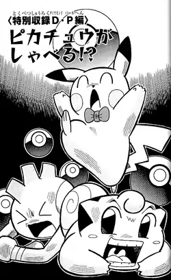 (Japanese: ピカチュウがしゃべる!? Pikachu Speaks!?) is the twelfth chapter of the Pocket Monsters HGSS manga created by created by 穴久保幸作 Kosaku Anakubo.