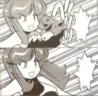 Deep within the Smokescreen from Green's Horsea on the third floor of Silph Co., Sabrina proves herself a powerful wielder of Psychic powers as she surprises the girl by having her Kadabra deliver a successful attack. With Kadabra's Psychic Sabrina clears up the smoke cloaking her illusion, and with then has Kadabra use Disable to prevent Green from moving. However, as Sabrina prepares to deal the finishing blow Green mocks her for ignoring her looks, as if to prove Green's superiority in appearances the girl's bust appears to jiggle. Angered, Sabrina has Kadabra use its spoon to slash across Green's chest, but as her dress tears Green reveals the two Poké Balls she had secretly hidden on her chest. Releasing Clefairy and Jiggly, Green has her Pokémon attack Sabrina with Growl and Sing, respectively, disrupting Sabrina's psychic focus with the sound-based attacks. As the illusion vanishes, Green decides that she can't fight the Gym Leader and her powers, and leaves the room with Sabrina's Marsh Badge.
