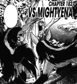 Making Mirth with Mightyena/VS Mightyena or A Rival, a Friend (Japanese: VS グラエナ VS Graena or 衝撃の出会い Shocking Encounter) is the 182nd round of the Pokémon Adventures manga.