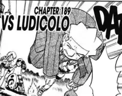 Mowing Down Ludicolo/VS Ludicolo or Clash With the Team in Blue (Japanese: VS ルンパッパ VS Runpappa or 対決 青装束 Clash With the Team in Blue) is the 189th round of the Pokémon Adventures manga.