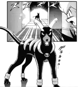 Showdown with Houndoom/VS Houndoom or Arrows and X-Ray Vision (Japanese: VS ヘルガー VS Hellgar or 矢印と透視力 Arrows and X-Ray Vision) is the 385th round of the Pokémon Adventures manga.