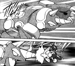 Raising the Stakes with Rhyperior/VS Rhyperior or Inheritor of the Land!/Inheritor of the Earth (Japanese: VS ドサイドン VS Dosidon or 大地の継承! Inheritor of the Ground!) is the 449th round of the Pokémon Adventures manga.