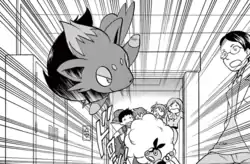 Just as the elevator reaches the 22nd floor, Zorua morphs back and fills the elevator with smoke. It then hops out into the game development center and wreaks havoc on the staff working there, before finding the stairs and making its way down. Tep decides to jump from the stairway to catch up to Zorua, but lands in front of another Tepig instead. Thinking that it's Gigi without her bow-tie, Tep greets the other Tepig happily. The other Tepig grins before kicking Tep down the stairs. It morphs back into Zorua and then leaps down the stairs to launch a swipe.