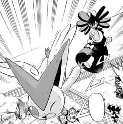 Once Victini does reach its limit, and starts to fall from the sky, the leading Grunt commands Gothitelle to knock it out with the slightest touch. Brav shields itself in front of Victini just as Gothitelle's attack is about to hit. The leading Grunt snickers at Black's hypocritical strategy, but suddenly Brav gains strength and manages to strike Gothitelle with an Aerial Ace. Black finds out through his Pokédex that Victini must have channeled its unlimited energy to Brav. Then, upon Black's command, Brav knocks Gothitelle out with Brave Bird. By this moment, Nite, Tula and Musha defeat the two Gothorita, and the residents being held hostage start to wake up. Knowing that their plan has been foiled, the three Team Plasma Grunts flee from the island, with the leading Grunt swearing her vengeance to Black. Meanwhile, Brav hovers towards Black with Victini on its back. After Black thanks Victini, it does a V sign with its hands while winking and then disappears.