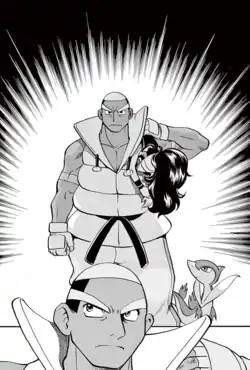 Evening has fallen in Nimbasa City. Black, who has been searching for his boss, White, since winning the Gym Battle with Elesa, finally makes a breakthrough in his search as he spots someone approaching his direction from the amusement park. Upon a closer look, that someone is a burly man carrying an unconscious White on his shoulders. A furious Black confronts the man, and orders his Pokémon forward, but the man calmly responds with his Throh and Sawk, which respectively brush aside Nite and Brav with ease, causing Tula to become terrified.