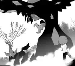 Trevor receives a Holo Caster message from the Professor Sycamore saying that the package containing items and Pokémon he sent to them should have arrived, and he rushes to his house to pick it up. Opening the box, he sees three Pokémon, a Chespin, a Froakie, and a Fennekin, all accompanied by a Pokédex. Trevor looks the sky, where Xerneas and Yveltal are fighting. Everyone that stayed at X's house are looking at the storm wondering what's going on there. Xerneas and Yveltal attack each other and blow up an entire hill in the process. Everyone in town start running away, except for Y who is still screaming at X's window to get out and to run with them, but he stays his room with a small light coming out of the ring around his wrist.