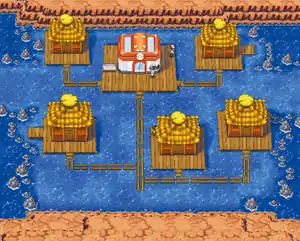 Pacifidlog Town is a small town built on wooden rafts and logs that float on top of a Corsola colony. The people living in Pacifidlog Town all fish and dive as part of their lifestyle. The ancestors of the people in Pacifidlog Town were said to have been born on boats, and lived and died aboard them. According to legend, they lived that way because they were searching for something.
