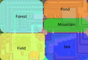 When the player reaches the pond area via the forest area, the player must travel a short distance east to reach the pond, a pool of water, able to be surfed across, where all the wild Pokémon inhabit. There are 37 Pokémon that can appear in this area. If the player travels south while getting there, they will find a ledge going down into the mountain area. Once entering the square pond to find Pokémon, they can go south to reach dry land, where they can also climb up and down stairs on the steep mountainside to reach the sea area. Alternatively, the player can enter from the sea area by traveling north through part of the mountain area to reach the southern part of the waterside, where the player can surf across the light water to the other side. There is no other way of getting to the pond in the northeastern corner.