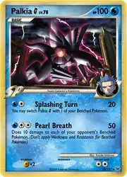 Palkia plays a major role in the schemes of Team Galactic in the Pokémon games. Though Cyrus himself never actually uses it to battle, he manages to summon it in Pokémon Pearl and Pokémon Platinum. The Spear Pillar is featured in the illustration.