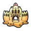 Palossand is a Pokémon resembling a yellowish sand castle with gray pebbles along the base. It has a square main castle for its body, two round towers for arms, and the top of another round tower with a conical point rising up from the body. A tunnel through the center of the main body creates a mouth. There is a line of five alternating blue and pink seashells over the top of its mouth. The central tower has six windows: three located in the front, one on each side, and one in the back. The two outermost windows in front of the central tower have tiny pebbles in them and appear to act as eyes. The two side towers have crenellations along the top with a ring of windows underneath. Palossand's main body has crenellations around the central tower. A ring of alternating pink and blue seashells surrounds the central tower just below the point. In the peak of its tower is a red shovel stuck handle-first into the top.