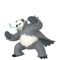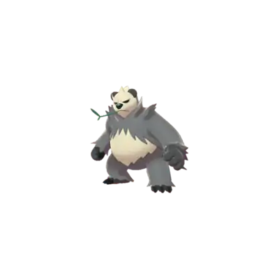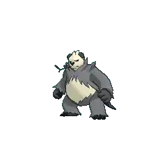 Pangoro is a large bipedal Pokémon resembling a humanoid panda bear. It has a stocky build with a round belly, short legs, and long arms with large paws. Its head and belly are covered in thick white fur, while its lower body, chest, arms, and back are covered in equally thick dark gray fur. A long cape of this dark gray fur hangs down behind its back; in combination with the rest of the dark-furred pattern, this gives the impression that Pangoro is wearing a long coat and trousers. Pangoro's three-fingered paws have shorter, darker fur and are tipped with black claws. It has a blunt snout with a triangular black nose, rounded black ears, prominent fangs in its lower jaw, and black semicircles under its brow that make its eyes indistinguishable. Pangoro likes to carry a thin-stemmed shoot with two leaves in its mouth. This small bamboo shoot is used to sense the movements of those around it.