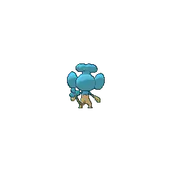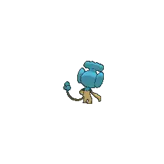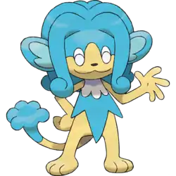 Panpour is a simian, blue-and-cream Pokémon. It has oval eyes that are usually seen closed, large ears with light blue insides, and a tiny, black nose. There is a puffy, wave-like crest on top of its head. Nutrient-rich water is stored in this crest. It also possesses a blue, frilled-like feature on its neck and upper shoulders. Its muzzle, lower body, and skinny forelimbs are cream-colored, and its hands seem to have no fingers, aside from a thumb. Its small feet both have three toes each. Its long tail has a clover-shaped tip. Panpour can keep itself damp or water plants by spraying water from its tail. It is mostly found near water sources.