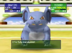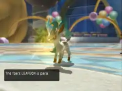 Paralysis (Paralyzed when inflicted in-game) is a negative status in the Rumble series. A Pokémon affected by paralysis is unable to move or use any moves for roughly five seconds. However, if the affected Pokémon is controlled by a player, inputting movement or button commands will make the effect wear off faster, with a minimum duration of about two seconds. Paralyzed Pokémon shake in place with their body surrounded by yellow lightning-bolt-shaped particles.