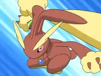 Lopunny was seen again during the competition, when Team Rocket came back to try to steal all the accessories. Lopunny easily damaged Team Rocket's mecha with Hidden Power and then sent it flying away with a double Bounce with the help of Buneary. It was later seen again in Memories are Made of Bliss! at Johanna's house on the cover of a magazine with Paris, and again in a picture on the wall along with Hermione, Buneary, Paris, and Dawn. Lopunny's only known moves are Hidden Power and Bounce. | ||