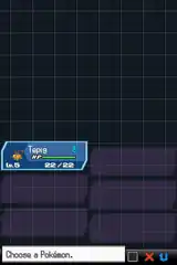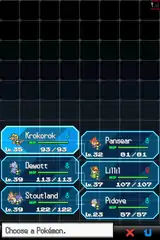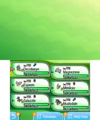 In Black and White Versions, the party screen is now fully able to interact with the Nintendo DS's touch screen, by being placed on the bottom of the screen. It functions similarly as it did in previous games. The player can view the back sprite of a Pokémon by tapping it while viewing information on it. Sliding the stylus up and down or left and right causes the Pokémon to jump, and drawing circles around the Pokémon makes it levitate.